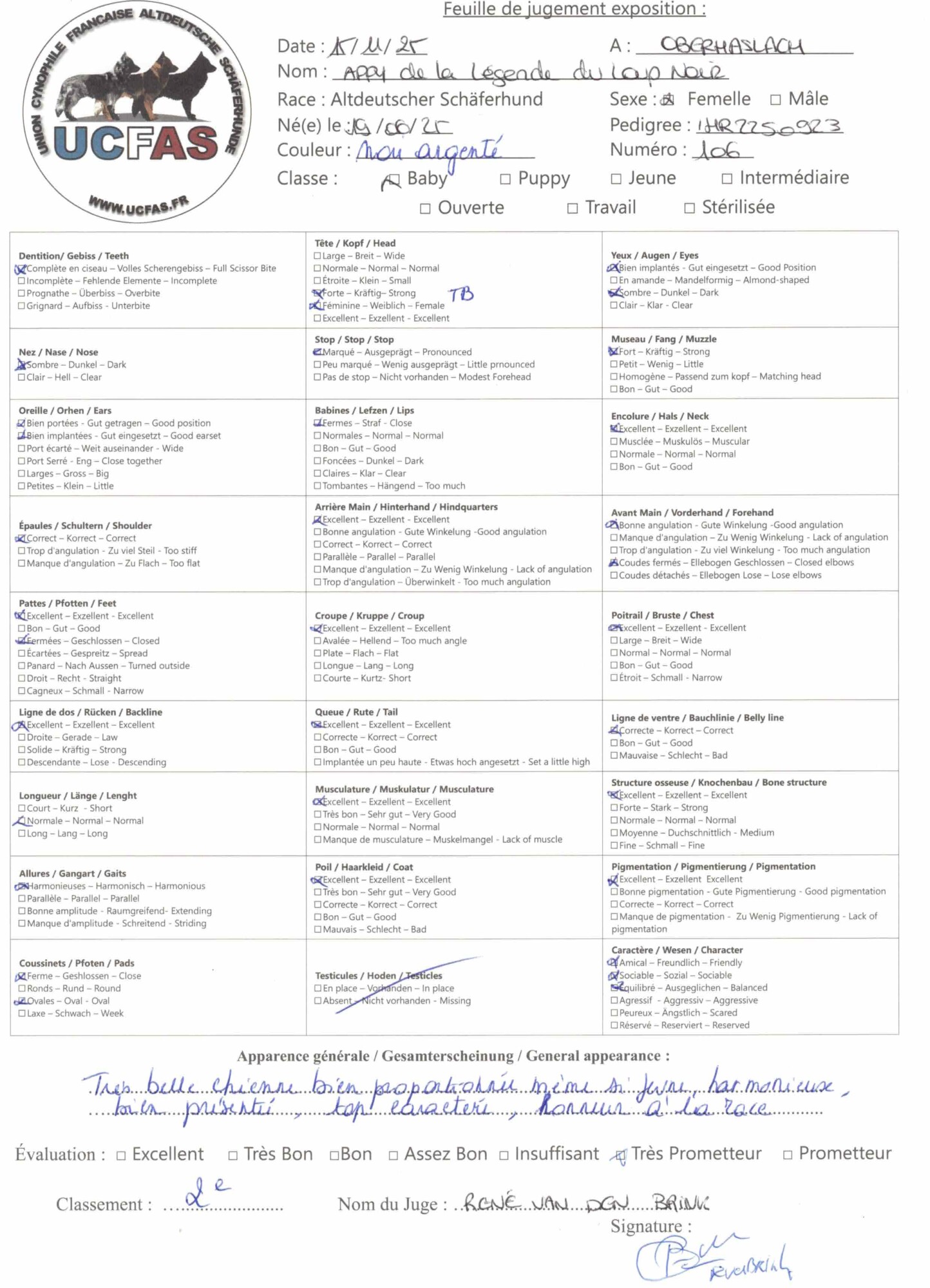 Nationale d’élevage UCFAS Oberhaslach 2025 classe baby : 2ème Très prometteur Slip du jugement de Appy (PDF).