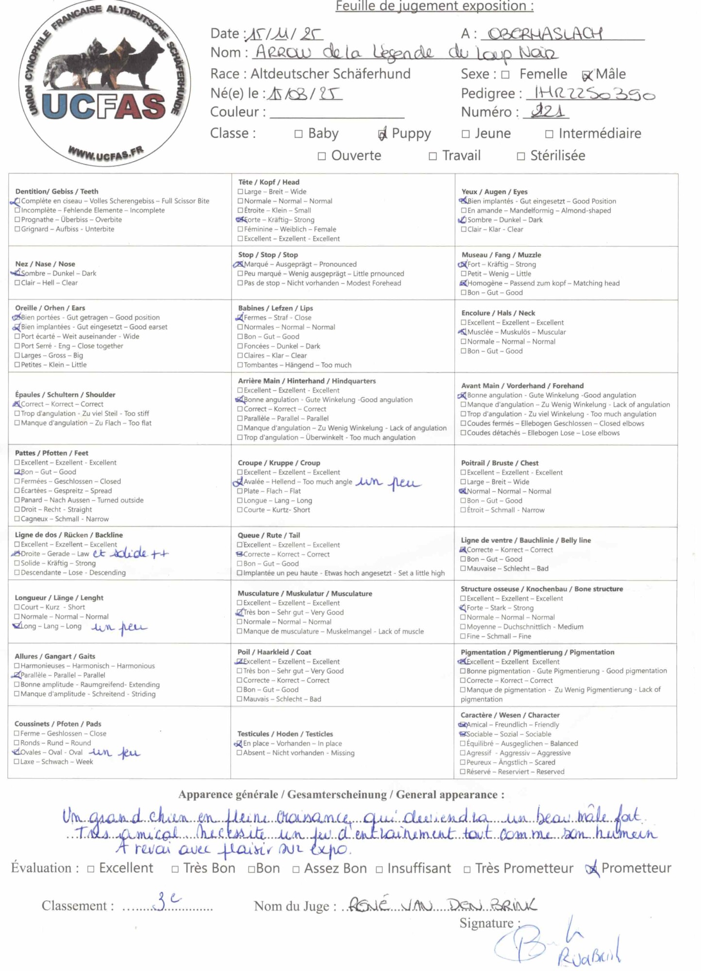 Nationale d’élevage UCFAS Oberhaslach 2025 classe puppy : Prometteur Slip du jugement de Arrow (PDF).