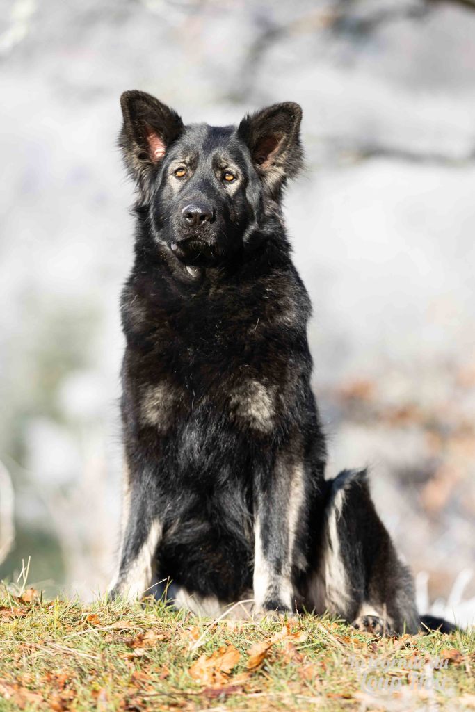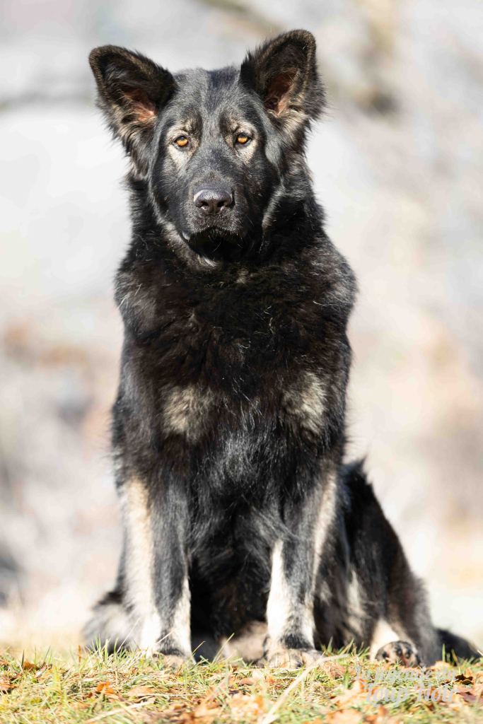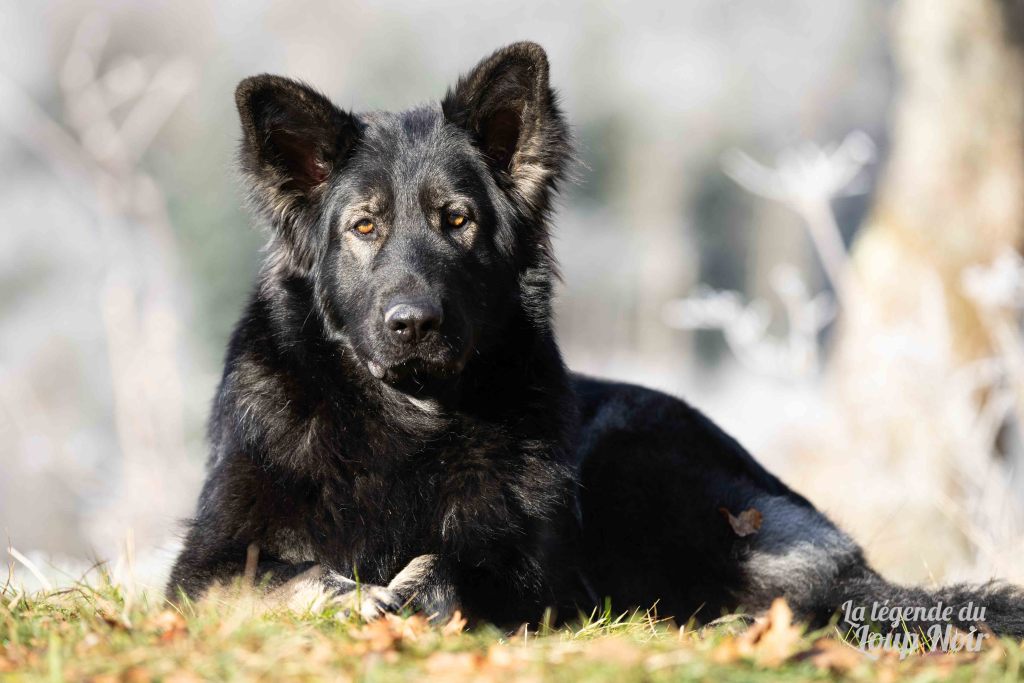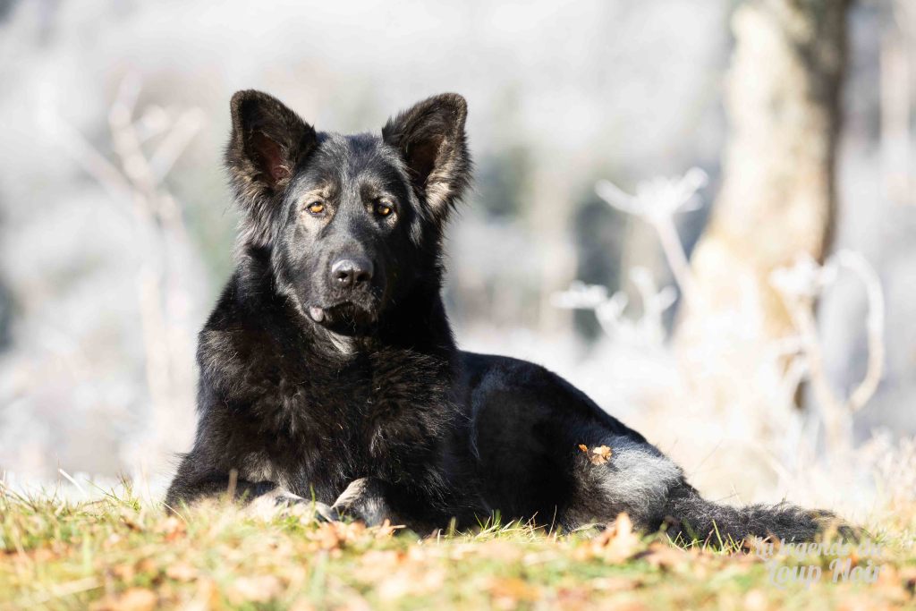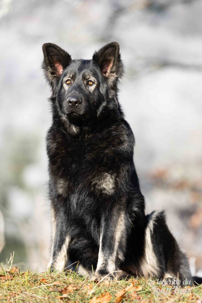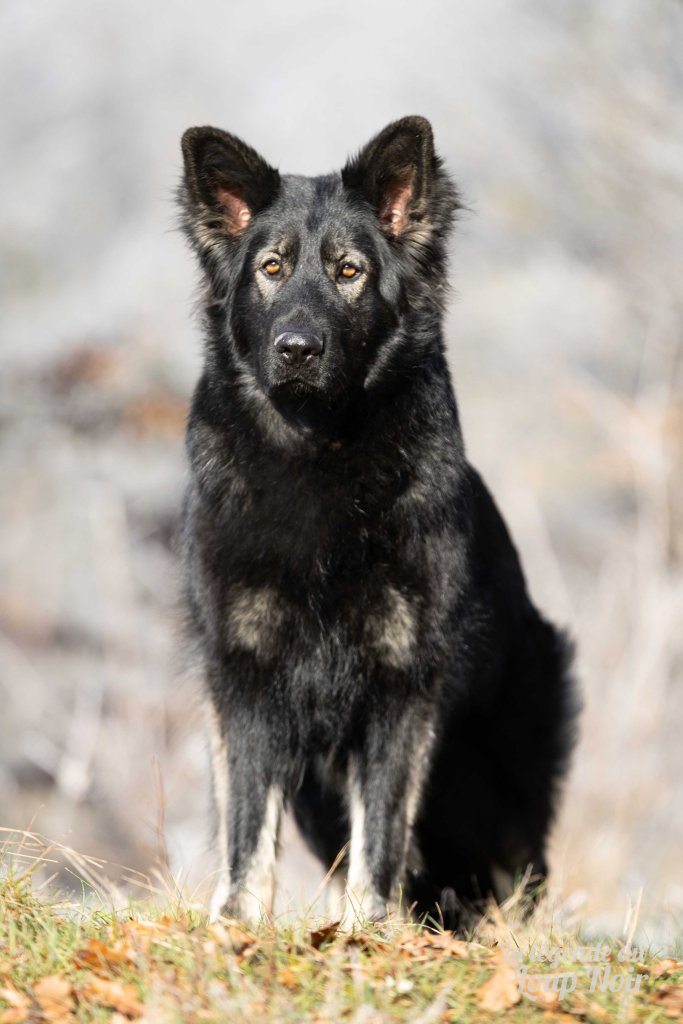 Elle est joueuse et a un petit côté espiègle qui lui permet de désamorcer ses congénères de notre meute. Elle est calme et posé comme son papa en dehors des parties de jeu 😉 Côté couleur, c’est de l’inédit dans notre élevage, un argenté charbonnée extrêmement foncé qui est très rare!