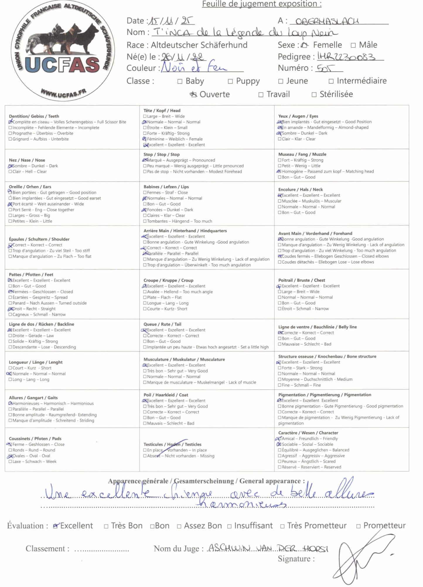 Nationale d’élevage Oberhaslach 2025 classe ouverte : Excellent Slip du jugement de T’Inca (PDF).