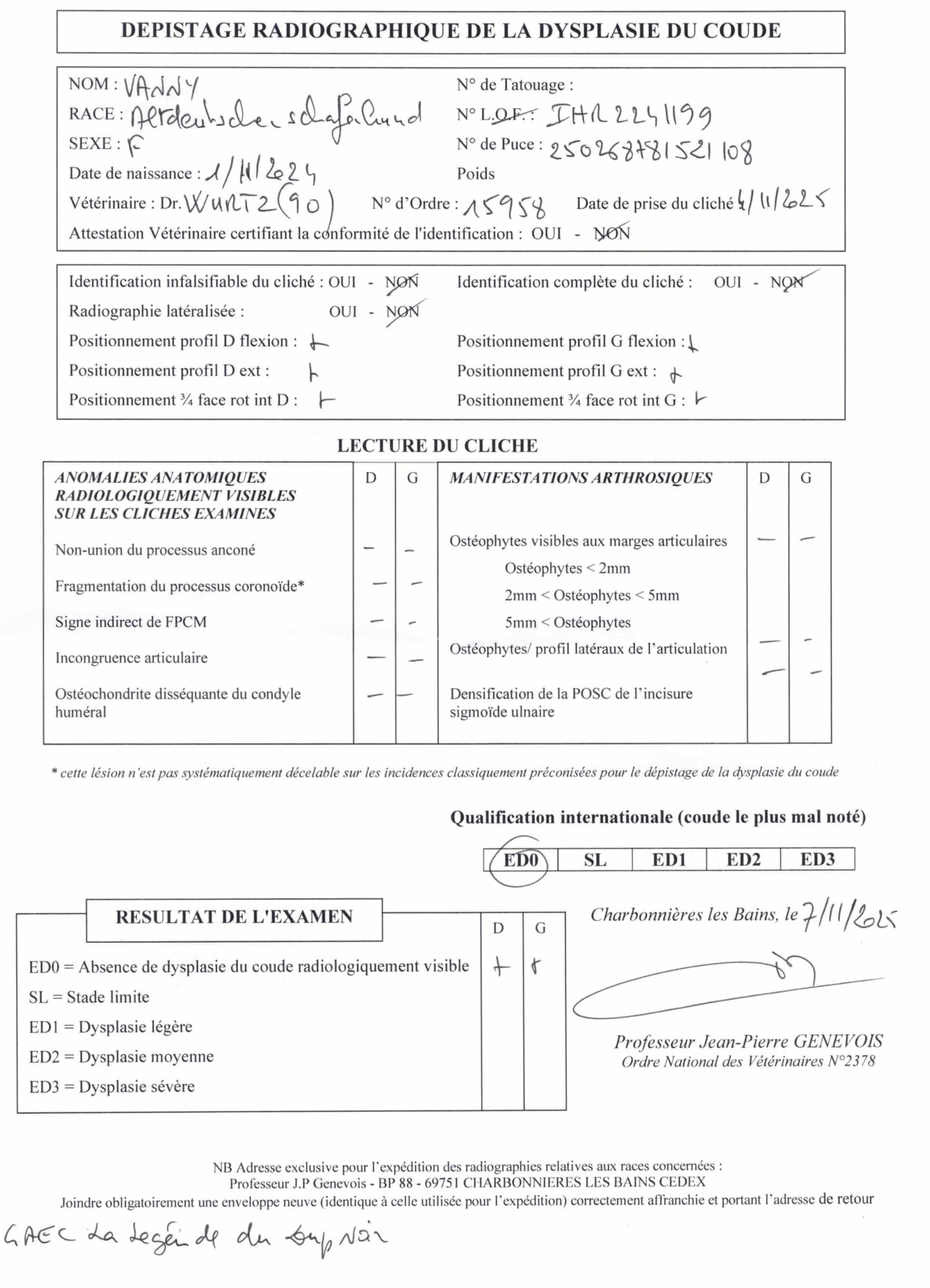 ED : O/O → résultat du dépistage de dysplasie des coudes de Vanny (PDF).
