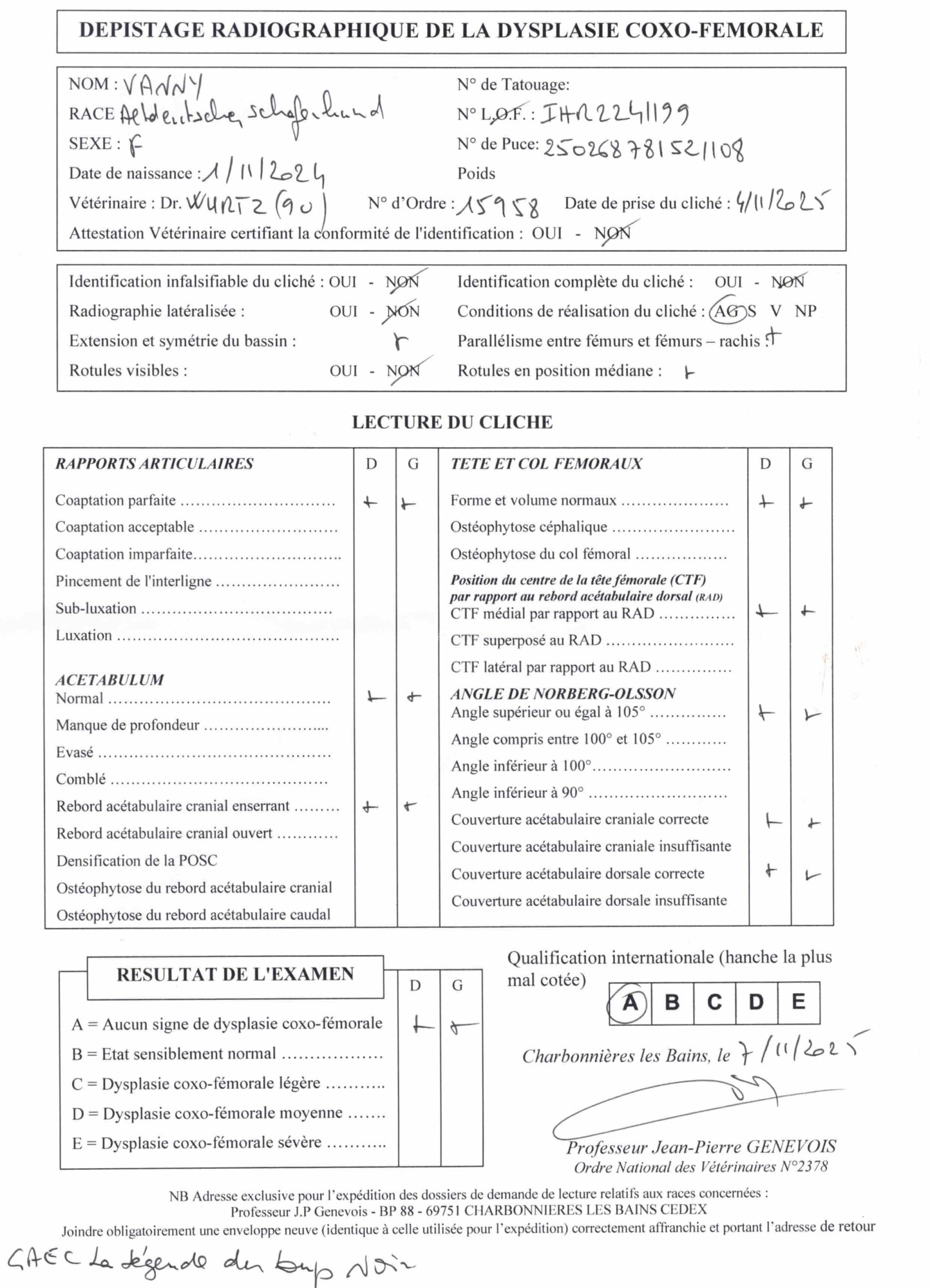 HD : A/A → résultat du dépistage de dysplasie des hanches de Vanny (PDF).
