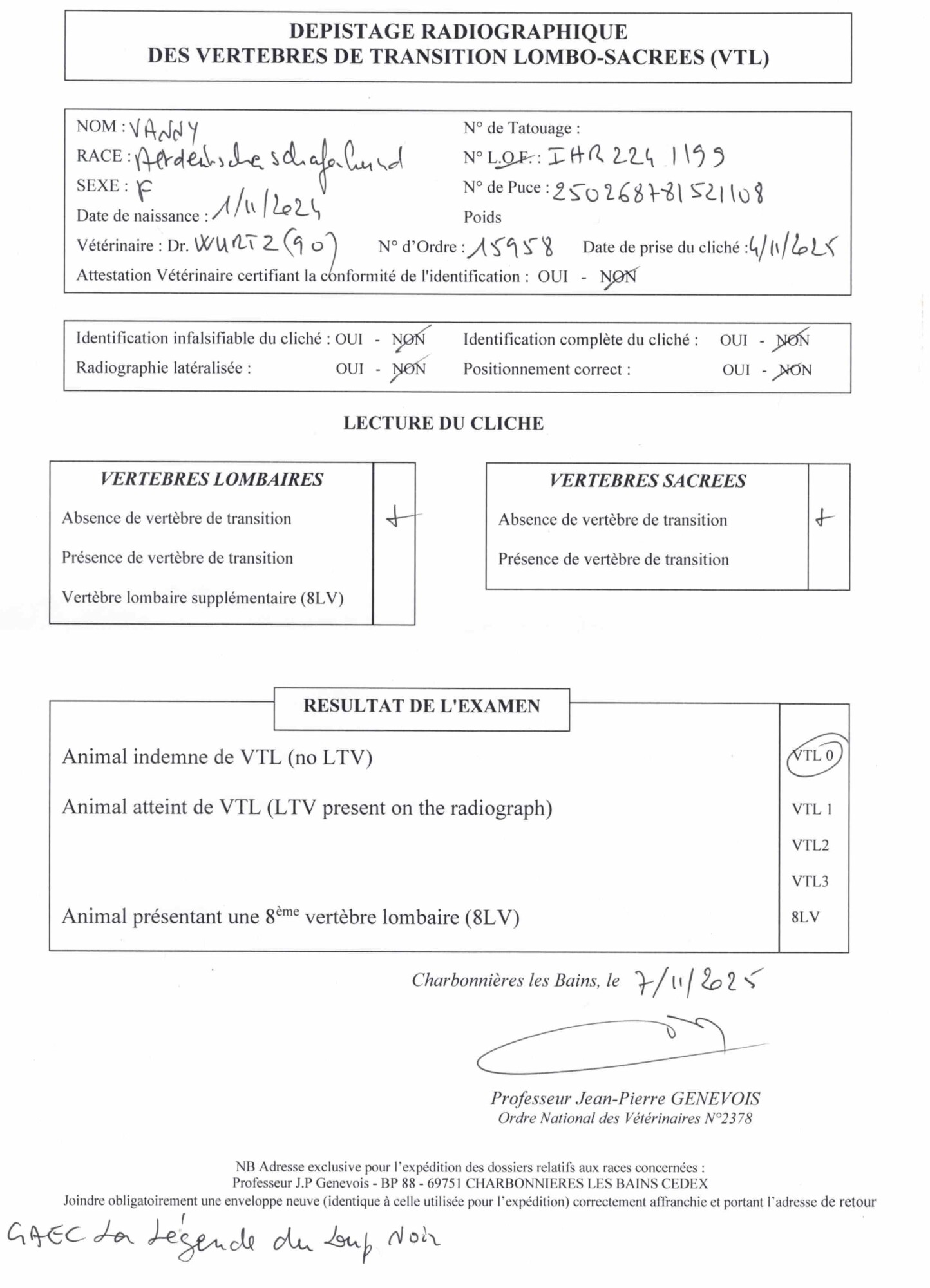 VTL : O → résultat du dépistage de la vertèbre de transition de Vanny (PDF).